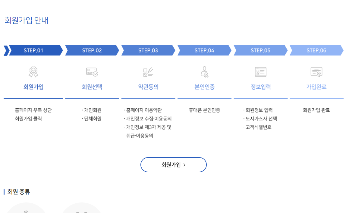 - 회원가입 > 회원선택 > 약관동의 > 본인인증 > 정보입력(도시가스사 및 고객식별번호 등) > 회원가입 완료