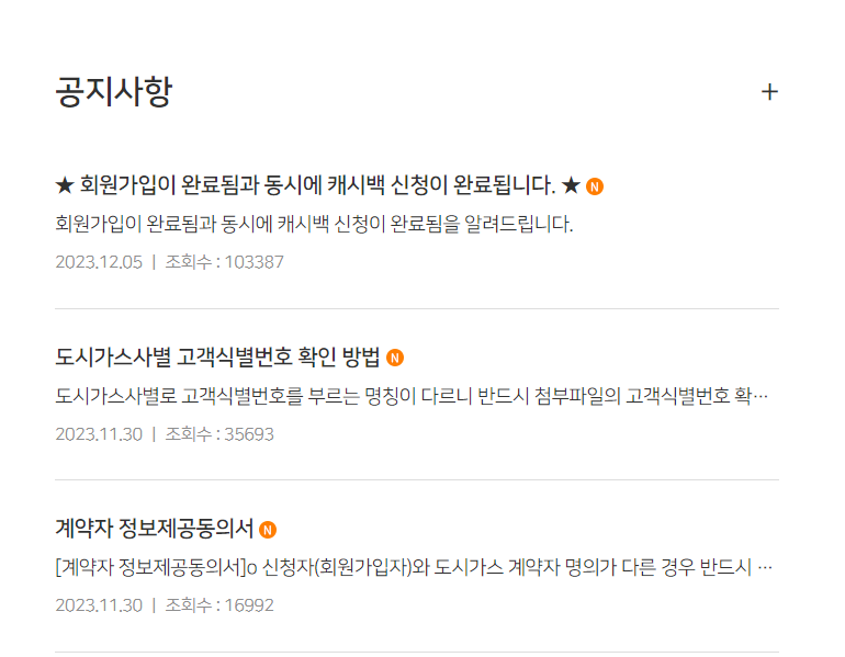 도시가스 캐시백은 위의 공지사항처럼 회원가입이 완료되면 동시에 도시가스 캐시백 신청도 완료되니 해당사항 참고하시면 될 거 같습니다.