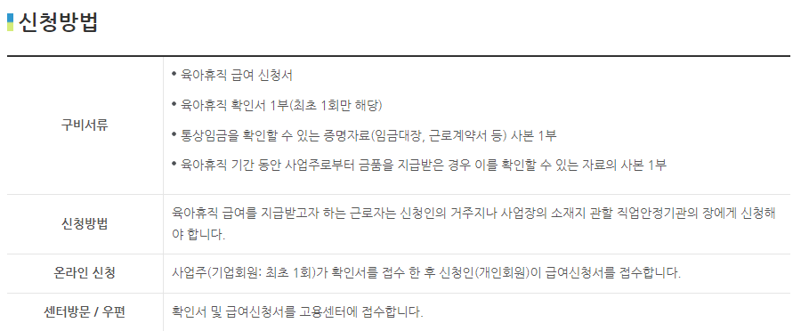 - 육아휴직 급여를 지급받고자 하는 근로자는 신청인의 거주지나 사업장의 소재지 관할 직업안정기관의 장에게 신청해야합니다.