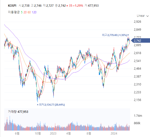 23년 10월 코스피가 바닥을 찍은 후 중간에 조정 및 하락세도 있었지만 꾸준히 상승하며 약 25~30% 상승을 보여주고 있습니다. 물론 그 배로 뛴 SK 하이닉스에 비해서는 큰 편이라고 볼 수 없어 주주들의 원성도 있지만 어디까지 오를지 조금 더 지켜봐야할 거 같습니다.